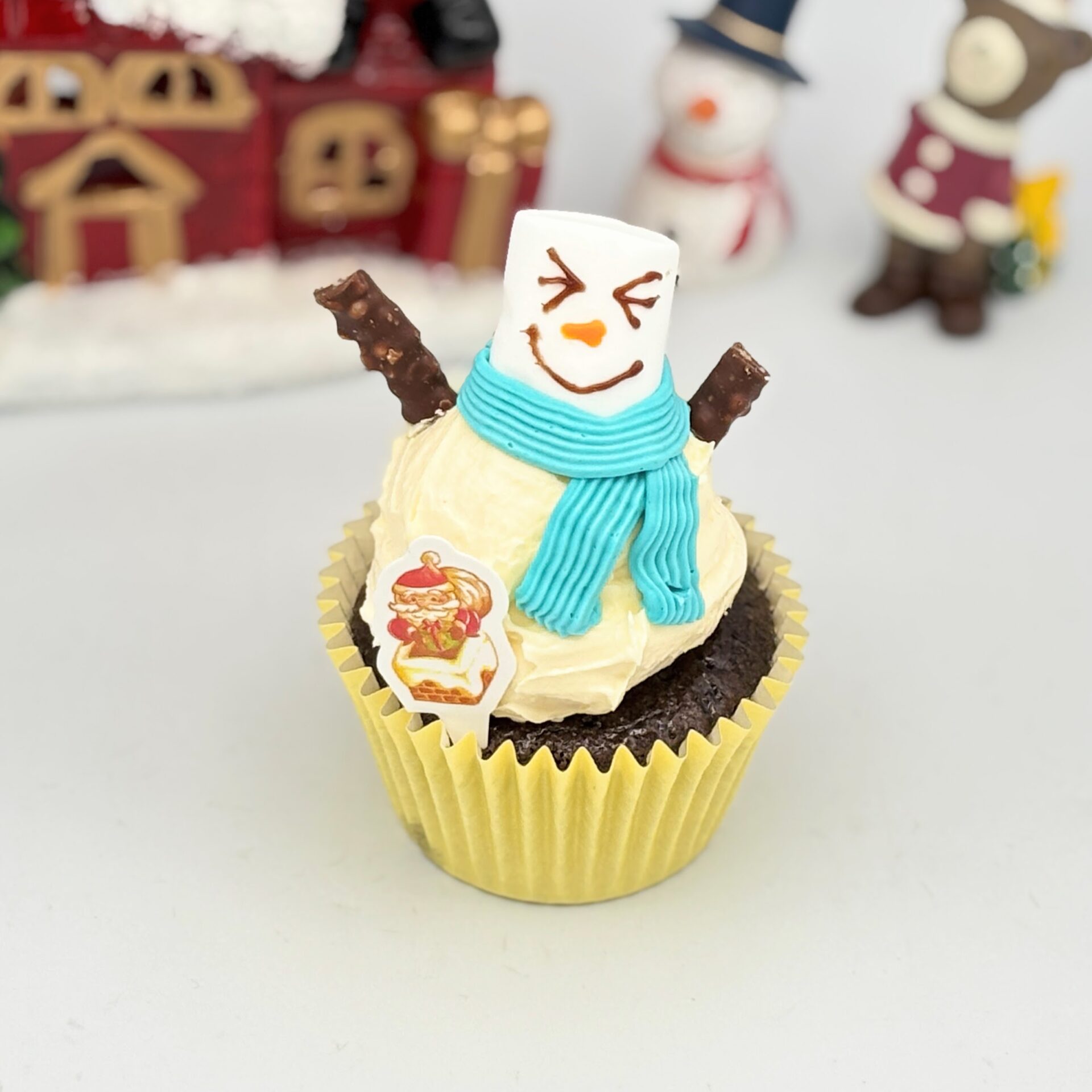 チョコチップ入りのチョコスポンジに、ブルーベリージャム入りのバニラバタークリームで胴体部分を作り、マシュマロの顔を乗せました。
