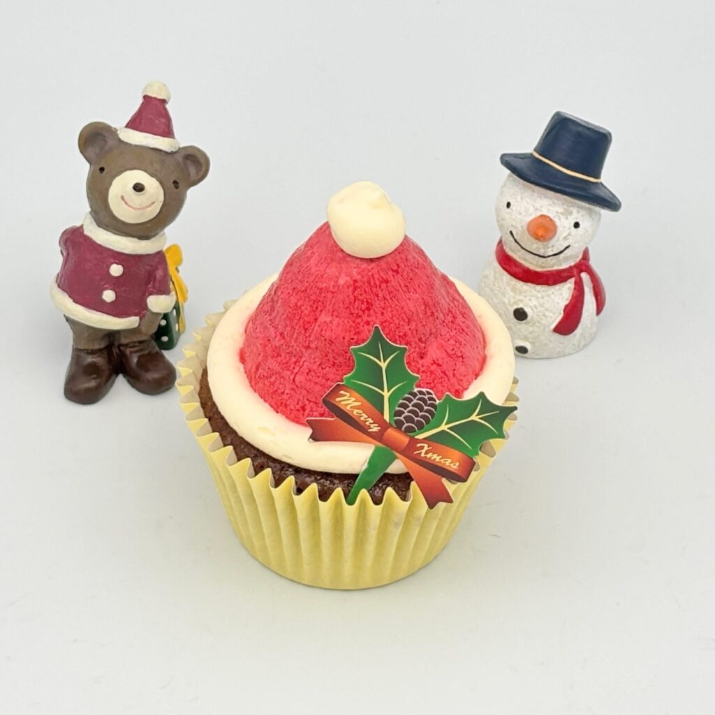 チョコチップ入りのチョコスポンジに、ラズベリーピューレのたっぷり入った甘酸っぱいバタークリームを、サンタ帽の形に絞って仕上げました。